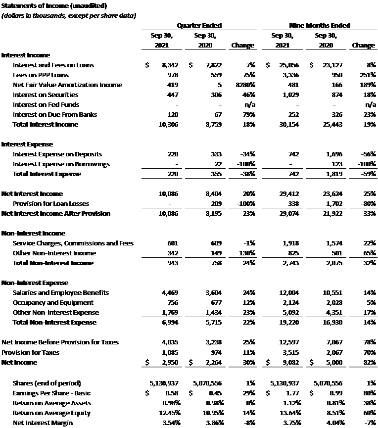 In 2021, the Bank has achieved an annualized return on average assets of 1.12% and return on average equity of 13.64%. Unaudited net income was $2,950,000 ($0.58 per share) for the third quarter ended September 30, 2021, compared to the $2,264,000 ($0.45 per share) earned in the same reporting period in the prior year.