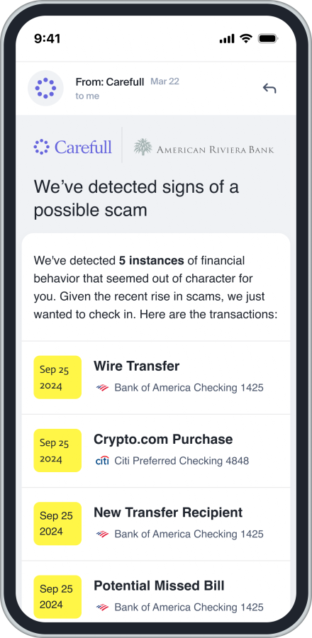 Financial fraud and scams remain serious threats as losses climb to record levels each year. American Riviera Bank's partnership with Carefull gives our clients reliable protection against these evolving dangers. Our system provides 24/7 monitoring, AI-powered fraud detection and immediate alerts to protect financial well-being.